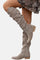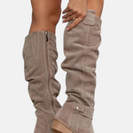 Un espíritu vintage con un toque moderno, diseñado para llamar la atención con cada paso. Estas botas hasta la rodilla combinan la libertad bohemia con una artesanía refinada. Confeccionadas en suave ante sintético, presentan una caña holgada con una textura perforada en toda su superficie, lo que les confiere un encanto artesanal.