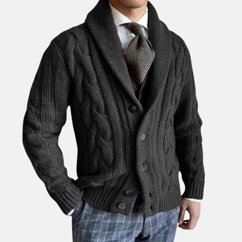 Descubra el Cárdigan de Punto de Cable para Hombre, una prenda que encarna herencia y artesanía de alta gama. Con un cuello chal lujoso y un cierre de botón, cada puntada revela precisión y un sentido de distinción que redefine el vestir invernal.