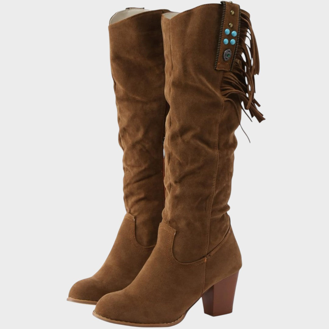 Botas vaqueras para mujer inspiradas en el estilo bohemio-western, confeccionadas en ante con detalles especiales. Presentan flecos laterales y decoración con piedras turquesas y elementos metálicos que les confieren un carácter único. Su tacón medio proporciona comodidad y elegancia, ideal para looks que combinan libertad y estilo.