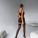 Incluye: Bustier sculpté, Falda audaz con recortes laterales y Slip assorti. Tres piezas que se complementan entre sí o se pueden lucir por separado, según tu ánimo y la ocasión.