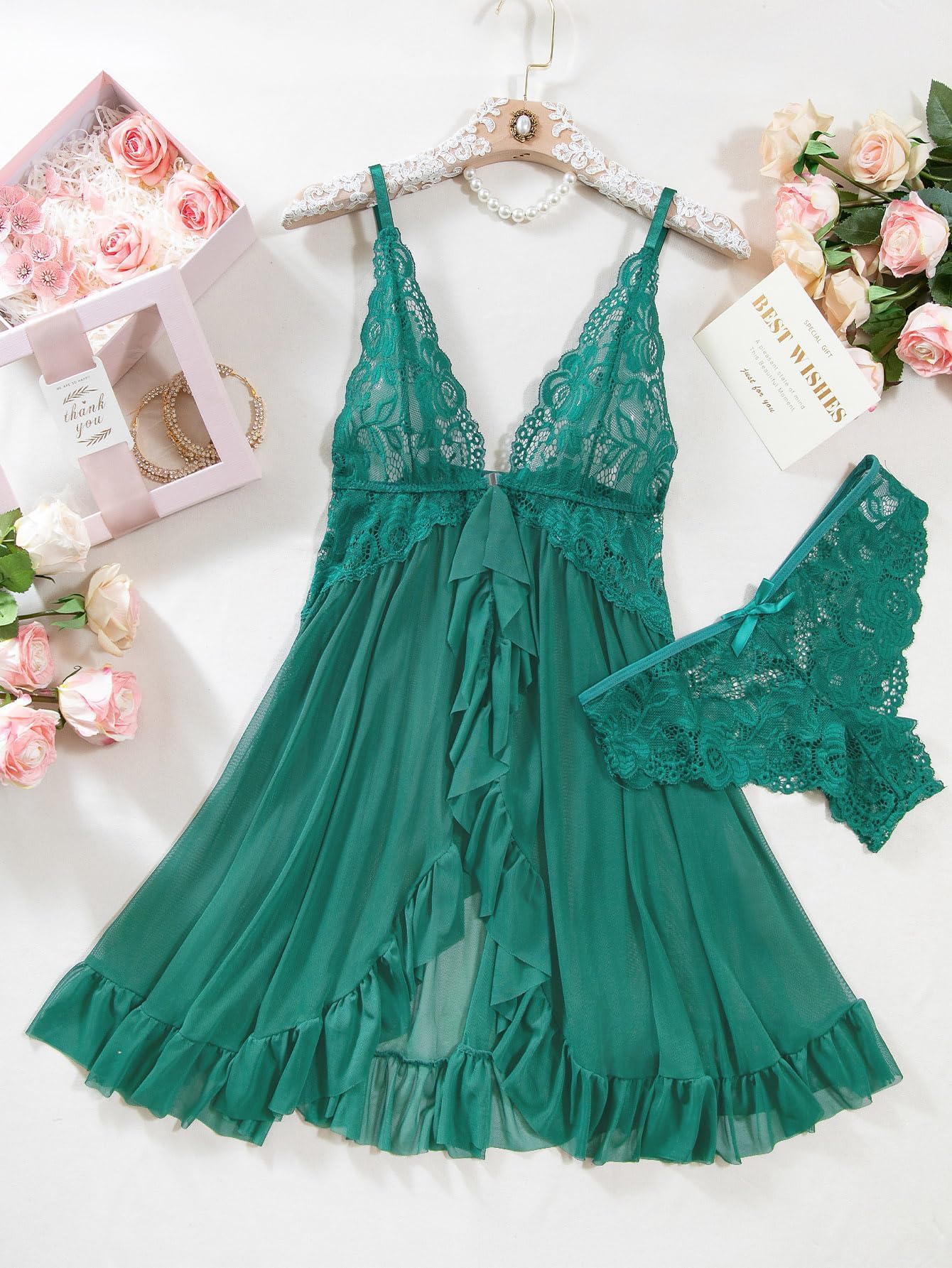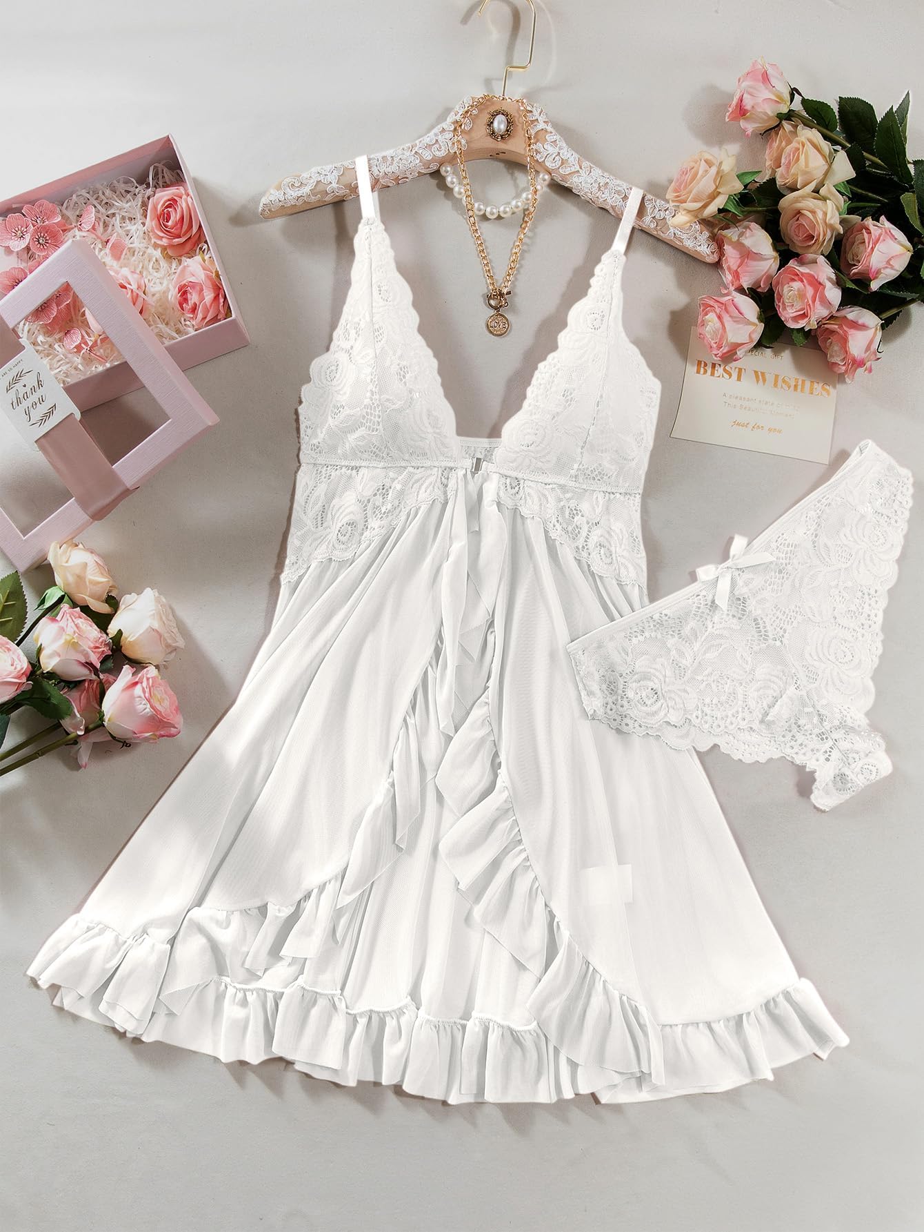 La combinación de malla ligera y encaje floral no solo luce espectacular, sino que también se siente suave y cómodo al tacto. El ajuste flexible envuelve el cuerpo sin oprimir, ideal para sorprender a alguien especial o para un momento de cuidado personal que te haga sonreír. El conjunto incluye un thong a juego para completar el conjunto con un acabado irresistible.