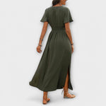 El vestido Carmen combina materiales de alta calidad que ofrecen transpirabilidad y comodidad. El elegante diseño con escote en V y el corte entallado crean una silueta favorecedora que irradia sofisticación.